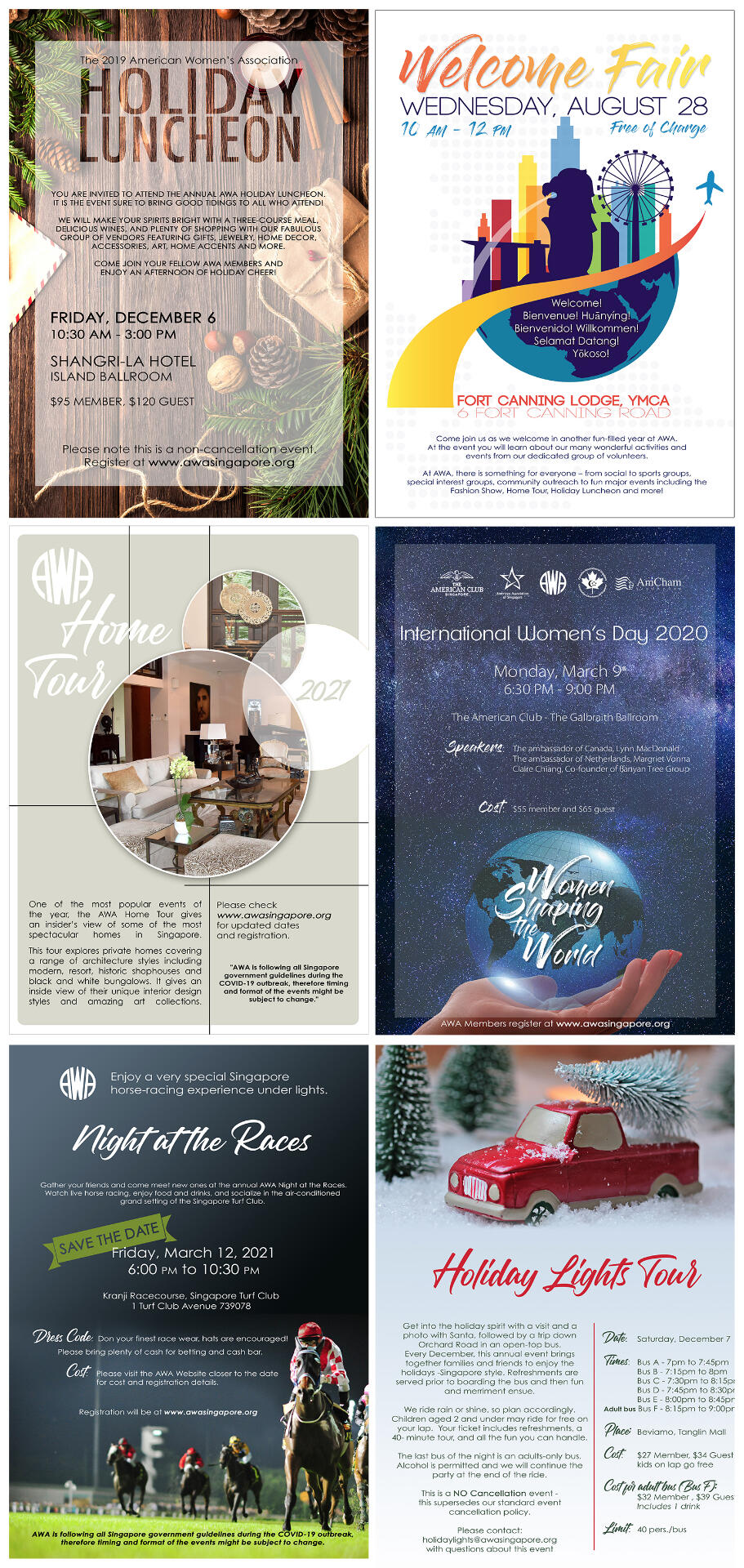 Most recently I have been doing Graphic Design for the American Women's Association in Singapore: redesigning their bi-monthly membership magazine as well as designing their print & digital media promo ads.